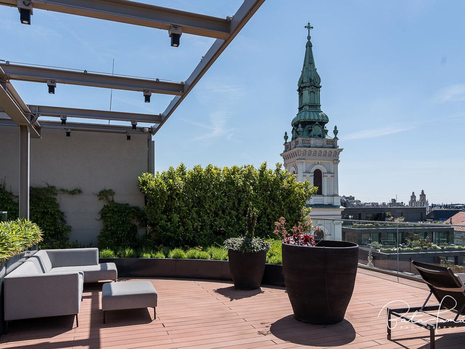 Az ingatlan adottsága tökéletes: a hatalmas 3 méteres belmagasságú, napfényes, dél-keleti tájolású nappaliból kilépve a teraszra, csodás városi panoráma tárul elénk: Szervita-téri templom, Szervita tér és a Gellért-hegy egy karnyújtásnyira van a horizonton.
